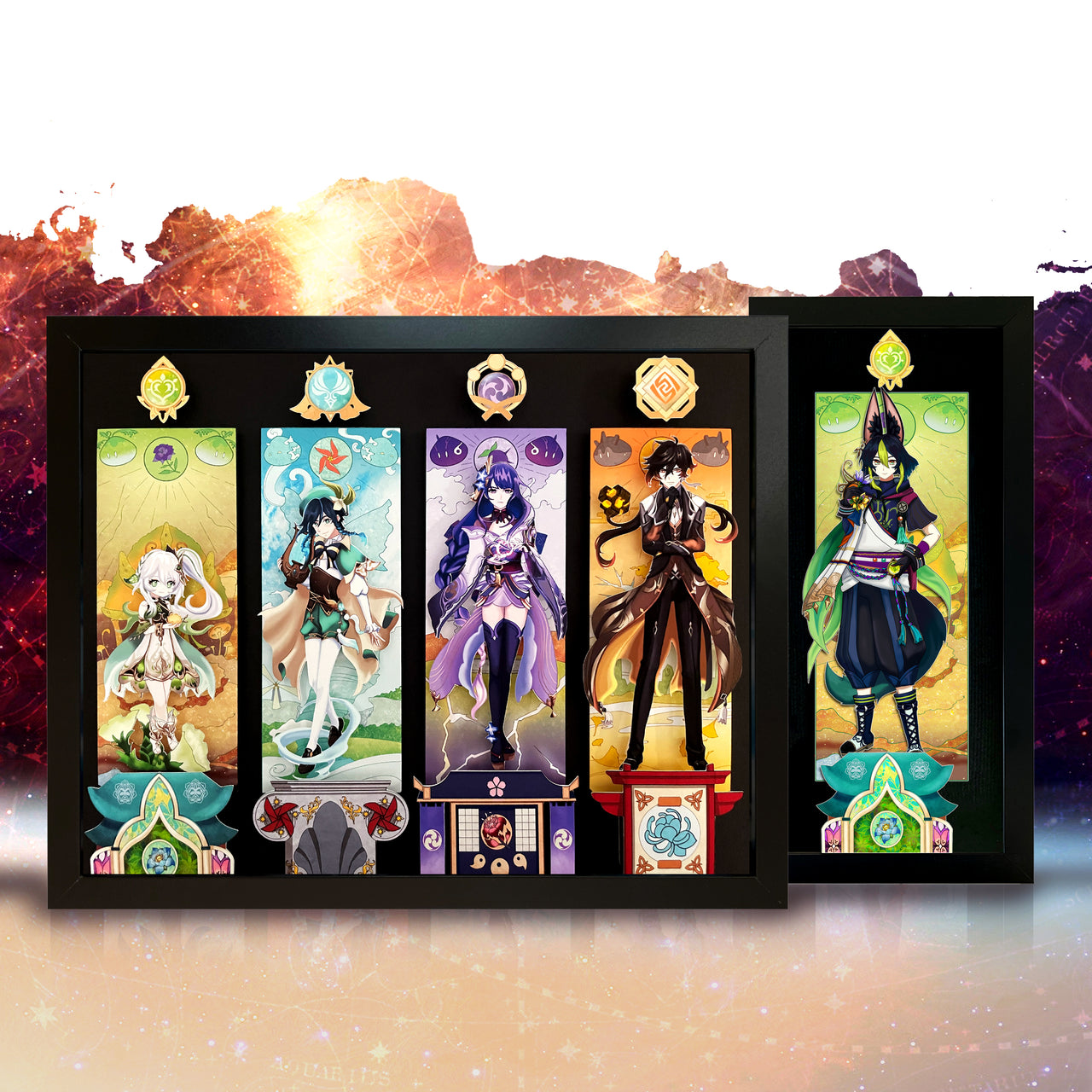 We have a limited selection of characters to choose from to help build your own custom Genshin Team. Each character panel features a unique elemental background, the elemental vision, and a custom pillar from the corresponding nation the character is from. All playable characters are available as single character shadowboxes or as a team of four!