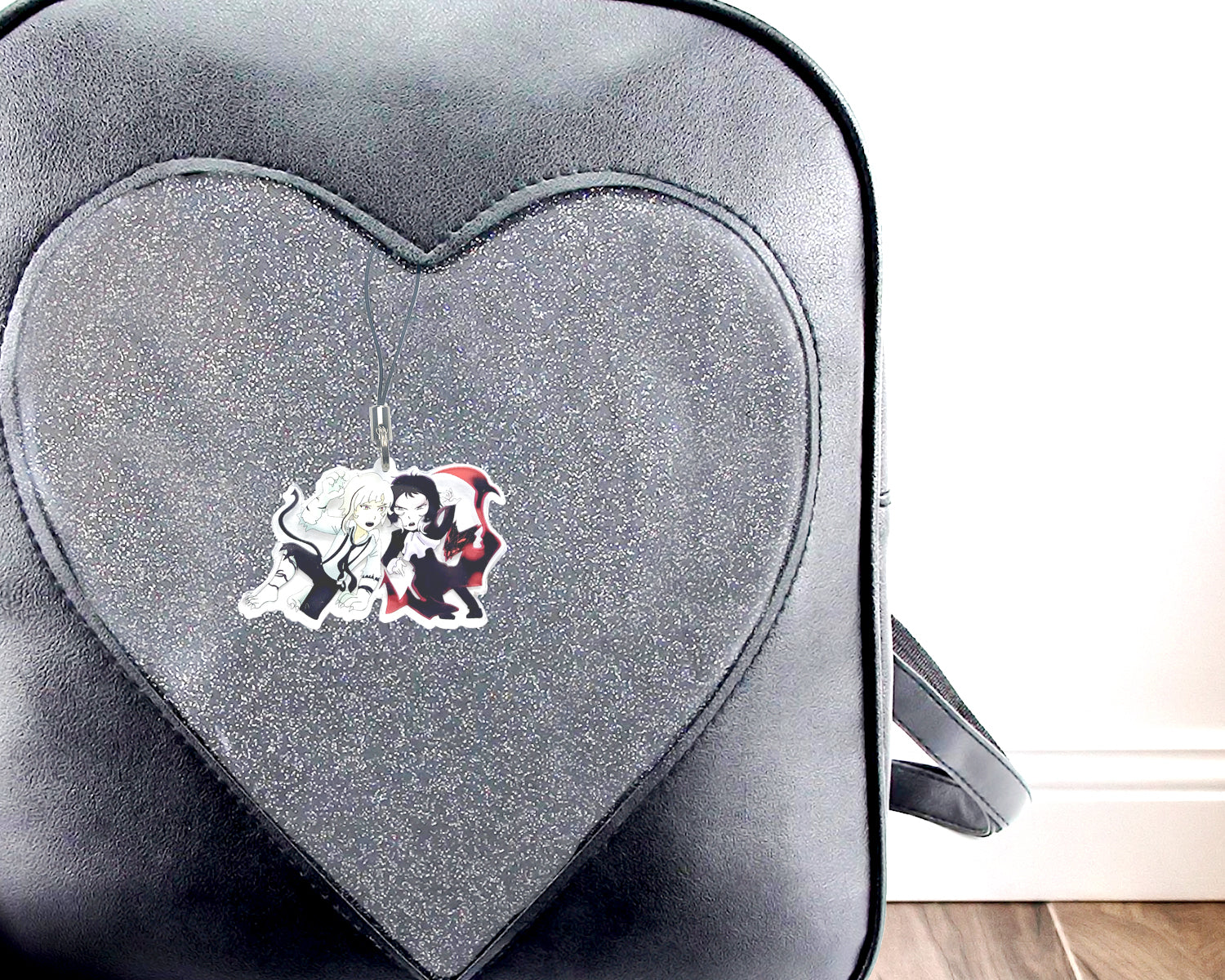 This item will come as 2.5 inch two-sided clear acrylic charm with a phone strap. Works great on Keys, Zipper Pulls, Cell Phones, Clear Panel Bags, and handheld Game Consoles.