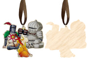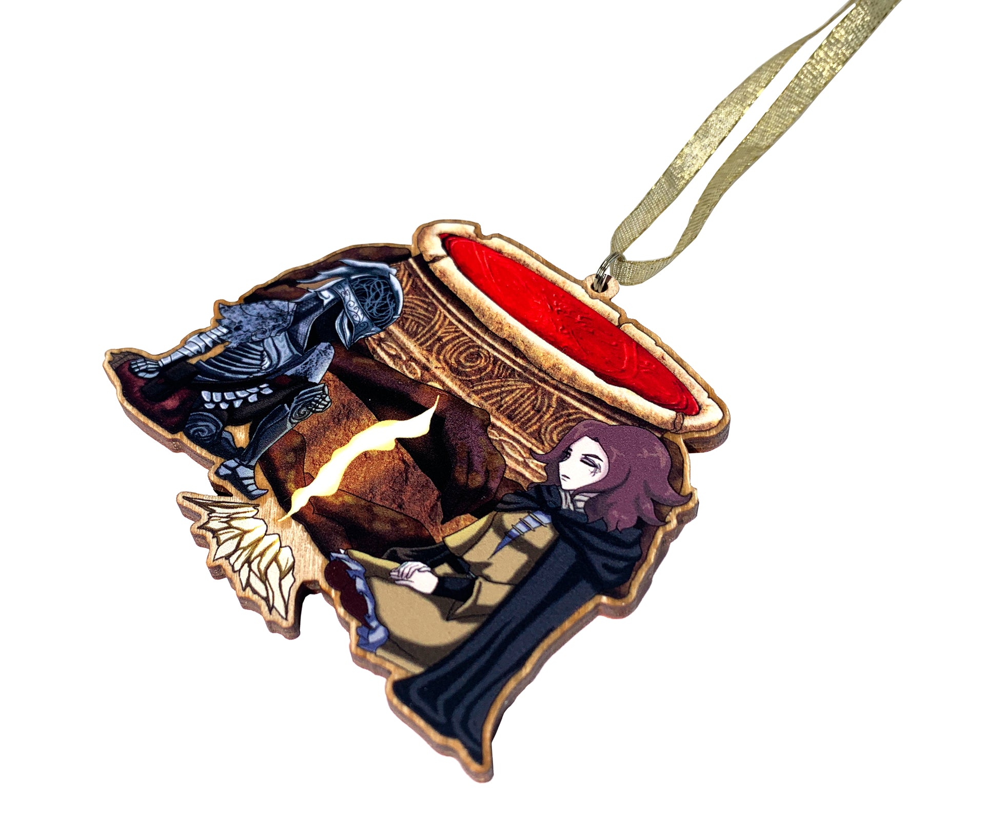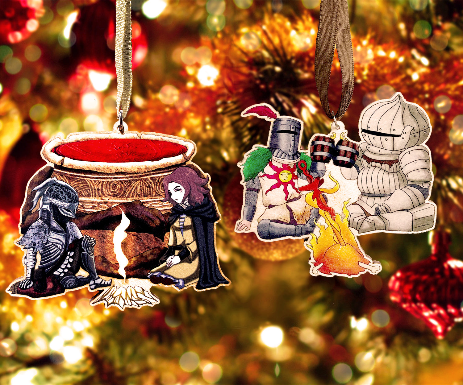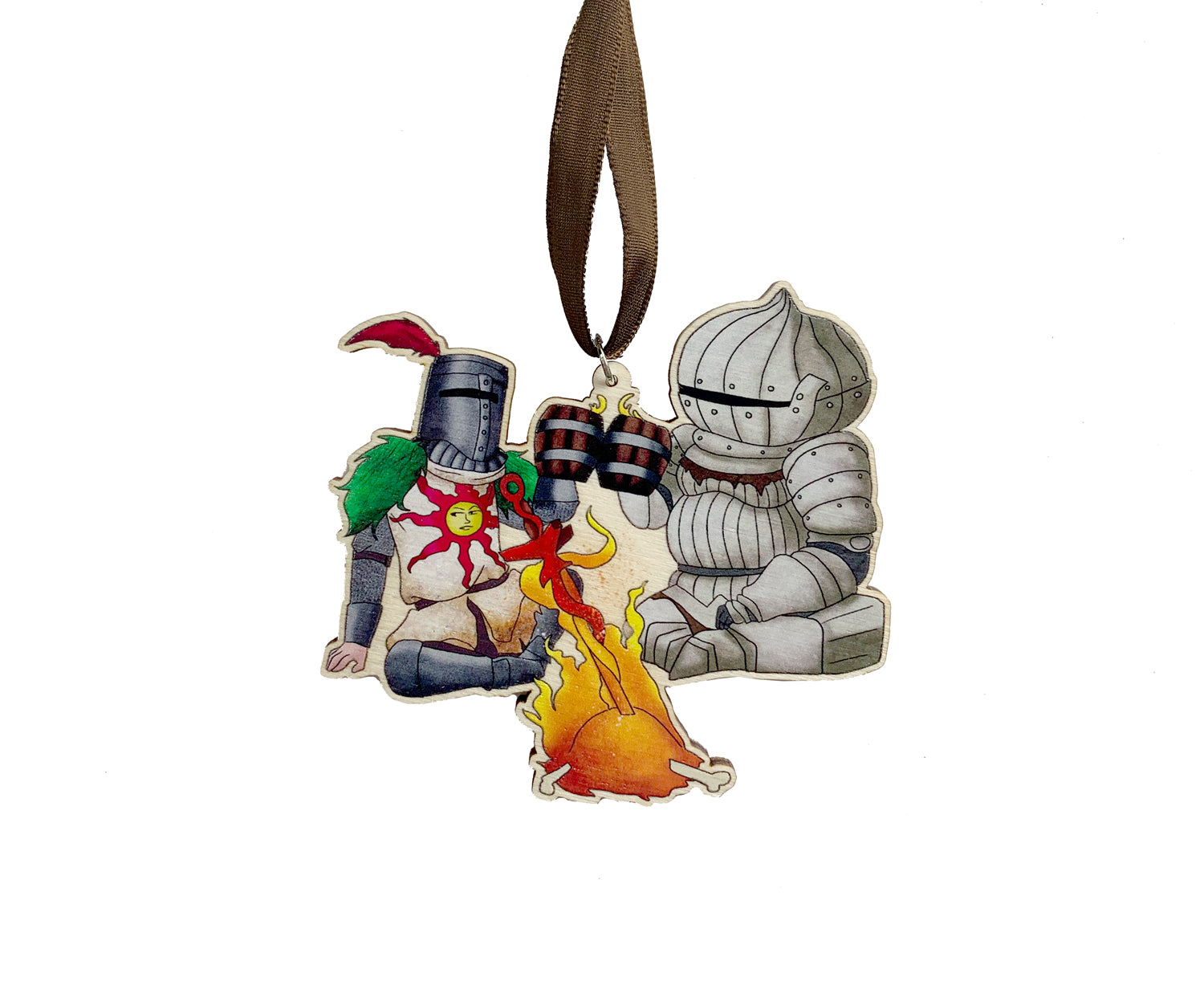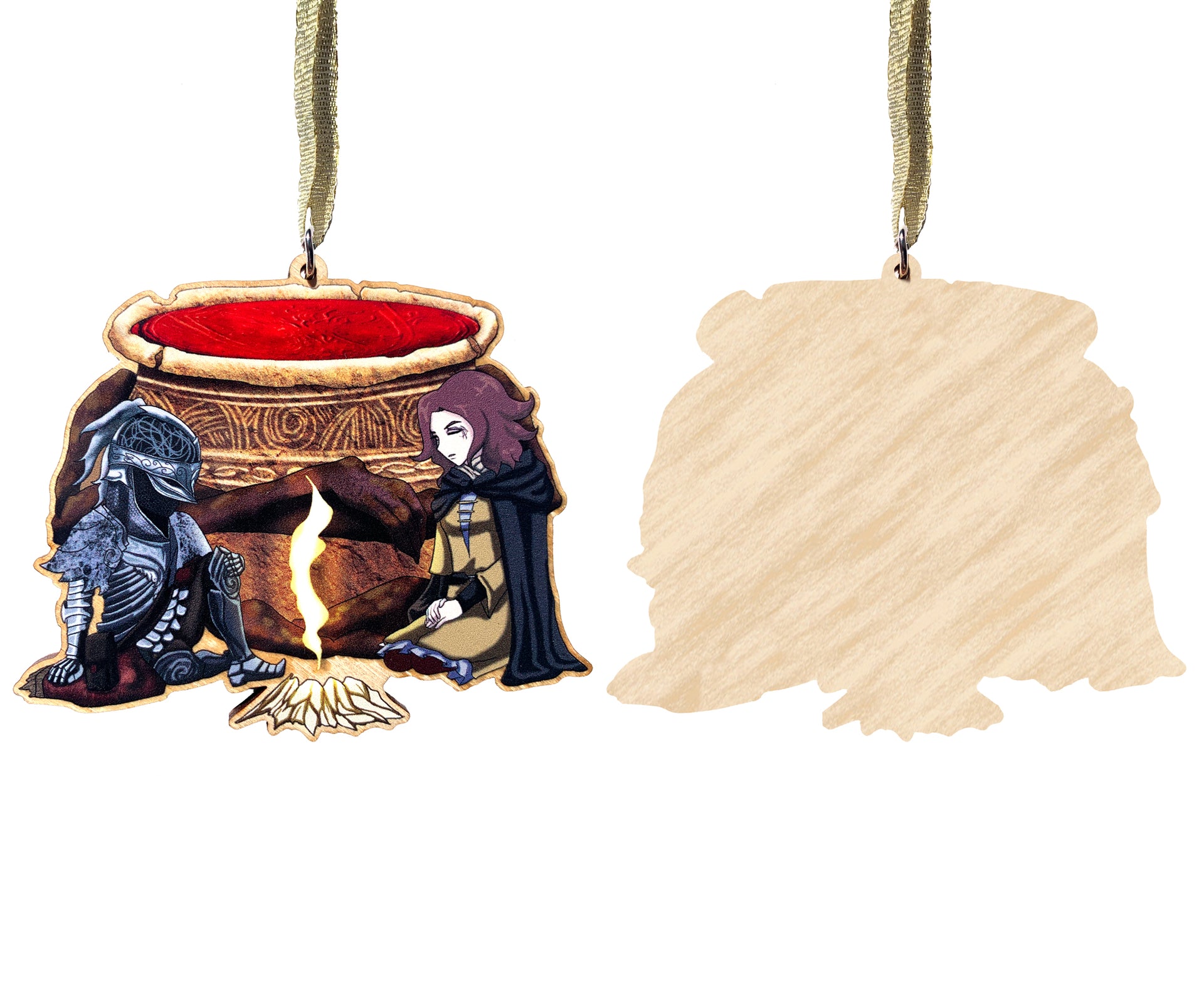 This Unique Wooden Ornament design is one of our Fan Artworks, featuring Solaire of Astora and Siegmeyer of Catarina from the Souls series toasting over a bonfire; Also included is a Wooden Ornament design featuring The Tarnished, Melina, and Iron Fist Alexander from the Lands Between; the perfect treat for yourself, a unique birthday gift, anniversary gift, Christmas gift, or even a housewarming gift. Our ornaments work well in an Office Setting, Kitchen, Classroom, Dorm Room, Living Spaces, and much more!