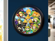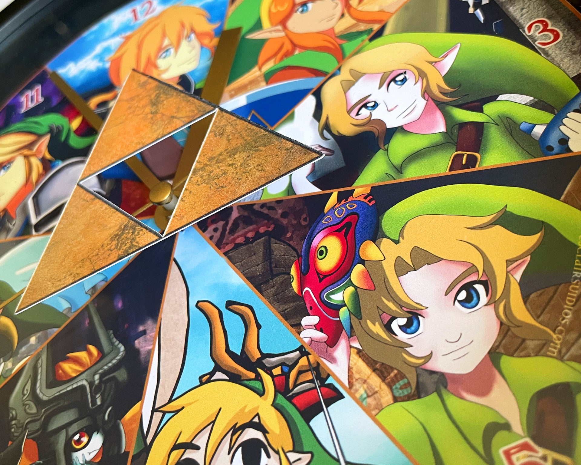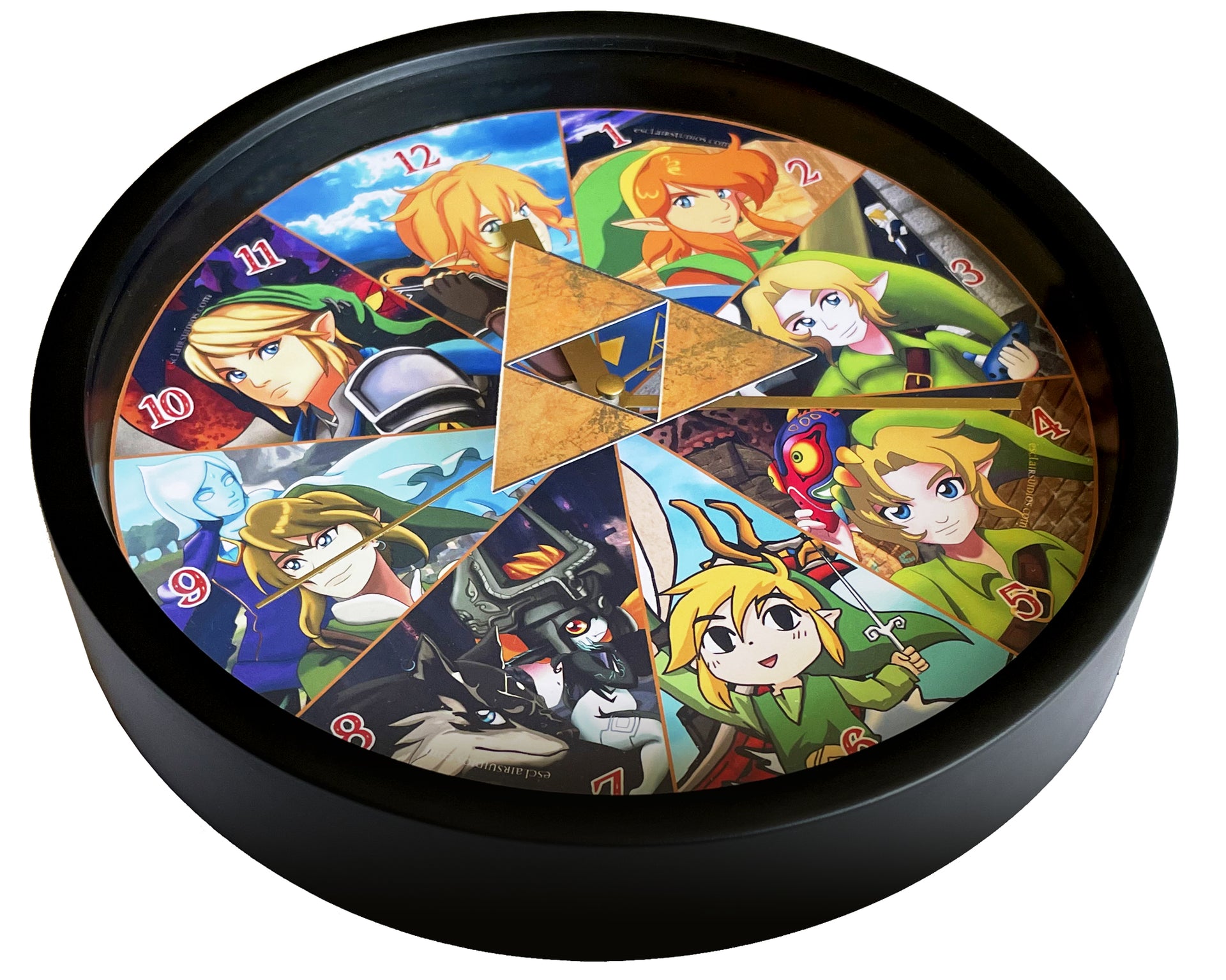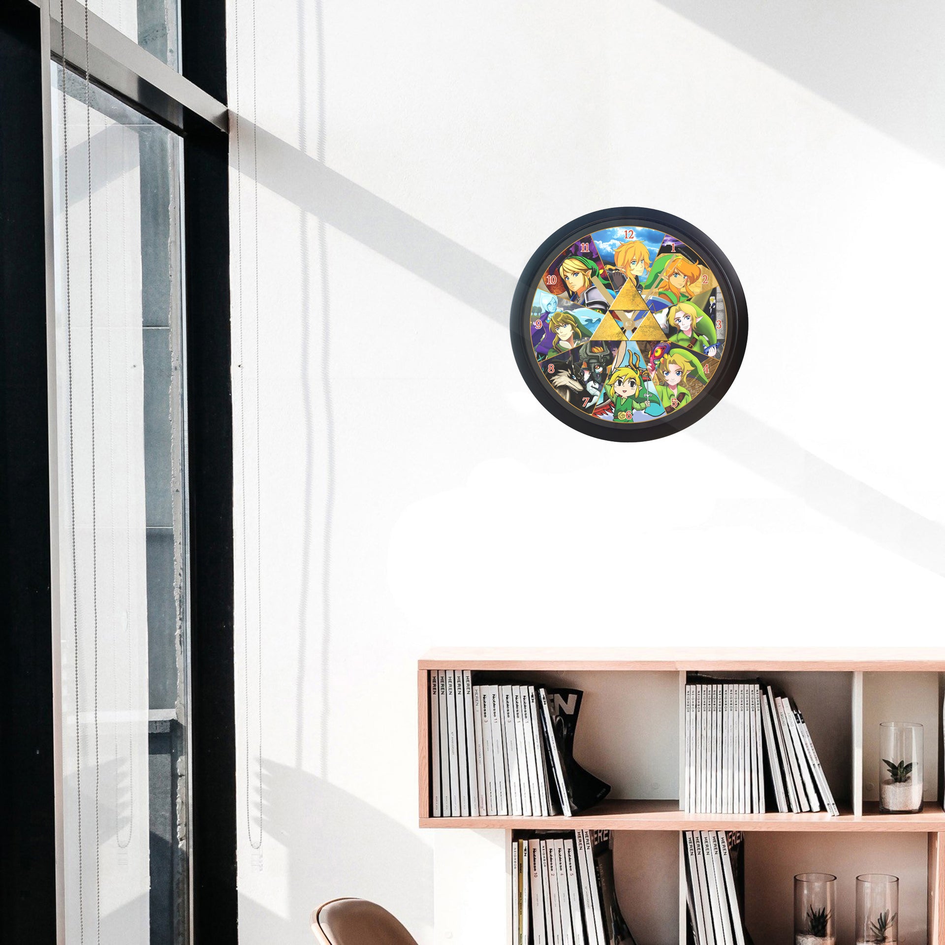 This Wall Clock features Link in the games - Link to the Past, Ocarina of Time, Majora's Mask, Wind Waker, Twilight Princess, Skyward Sword, Hyrule Warriors, and Breath of the Wild; making this the perfect treat for yourself, a unique birthday gift, anniversary gift, Christmas gift, or even a housewarming gift.Our Clocks work well in an Office Setting, Kitchen, Classroom, Dorm Room, Living Spaces, and much more!