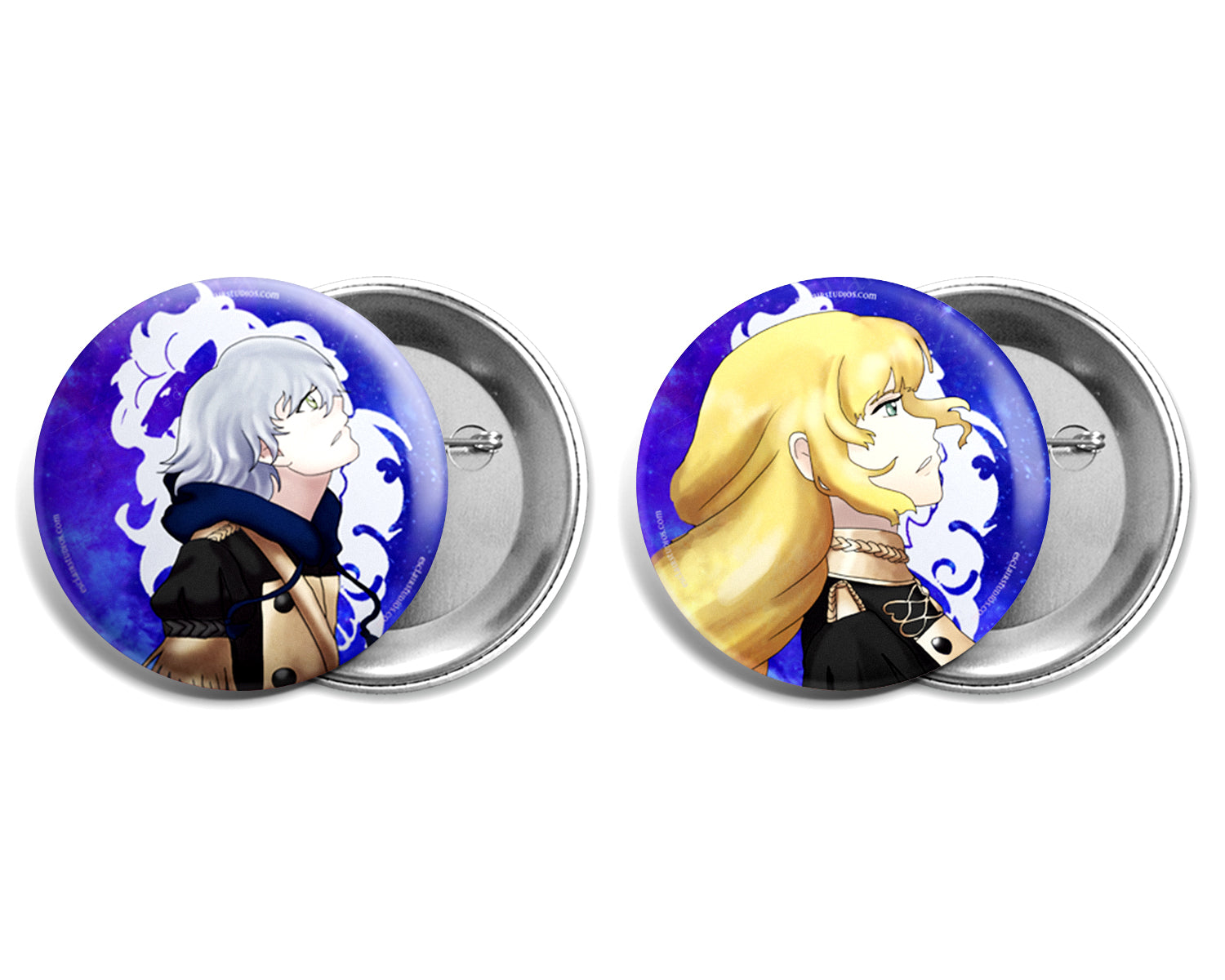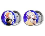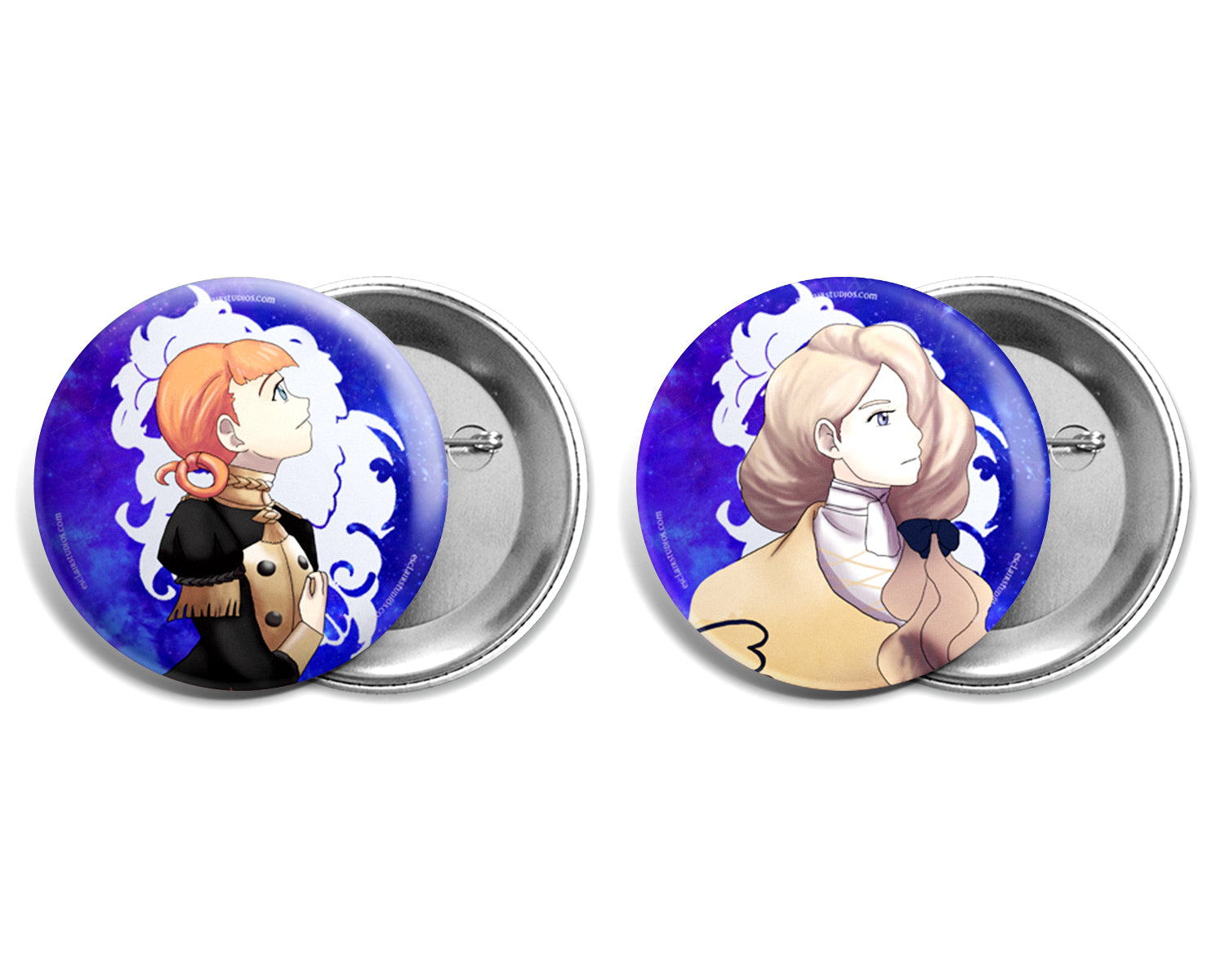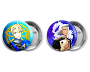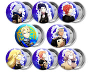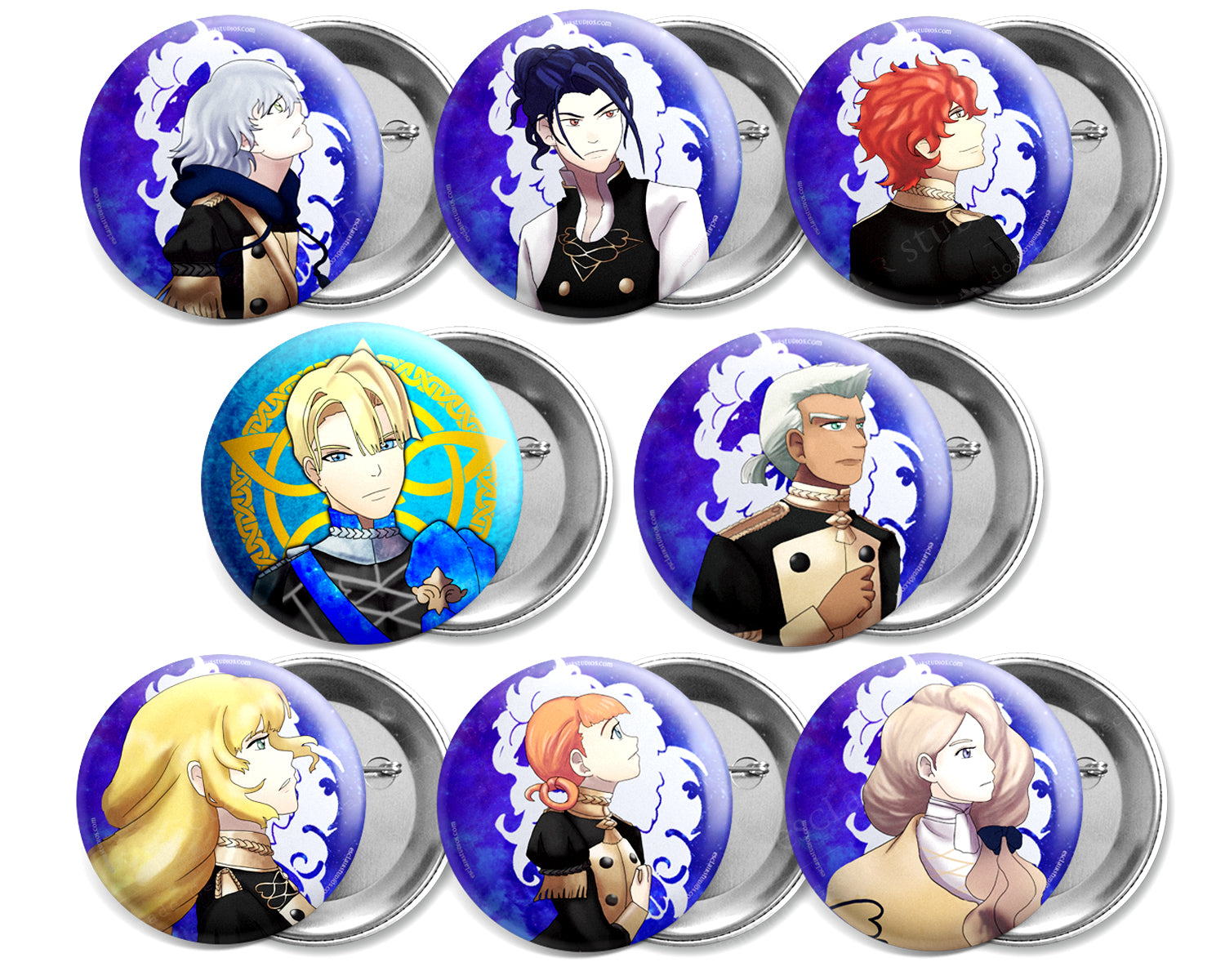 This set includes Dimitri, Dedue, Annette, Ashe, Merce, Sylvain, Felix, and Ingrid as pin back buttons, from Fire Emblem Three Houses. The Perfect button set for the Blue Lions fan!