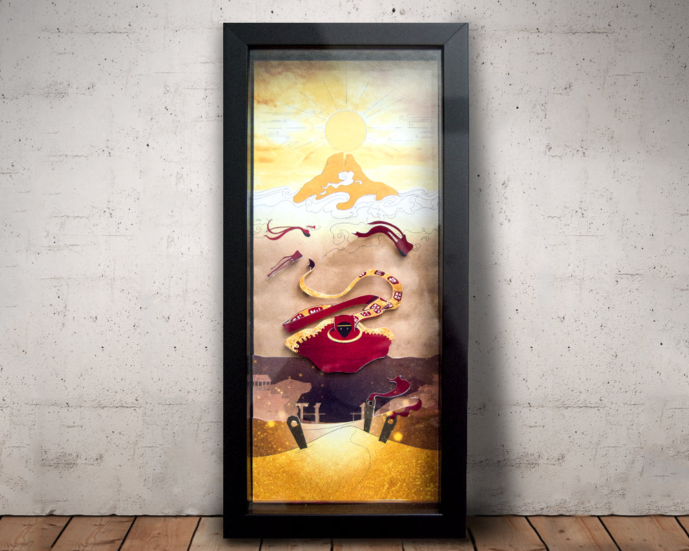 This shadowbox 3D artwork comes in a 6 x 14 inch frame with a 1.5 inch depth. All artwork is printed on a variety of high quality papers, including cardstock, and metallic photo paper. The art is then hand cut and assembled. Each Shadowbox may have slight variations, making each one unique and different.