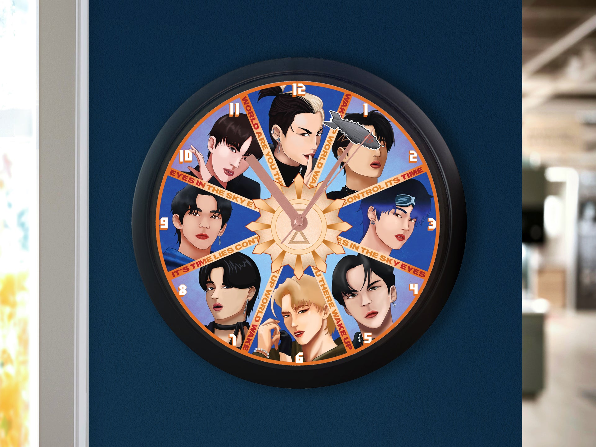 This Unique Wall Clock design is one of our Fan Artworks, featuring all the members of Ateez, the perfect treat for yourself, a unique birthday gift, anniversary gift, Christmas gift, or even a housewarming gift. Our Clocks work well in an Office Setting, Kitchen, Classroom, Dorm Room, Living Spaces, and much more!