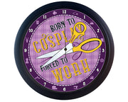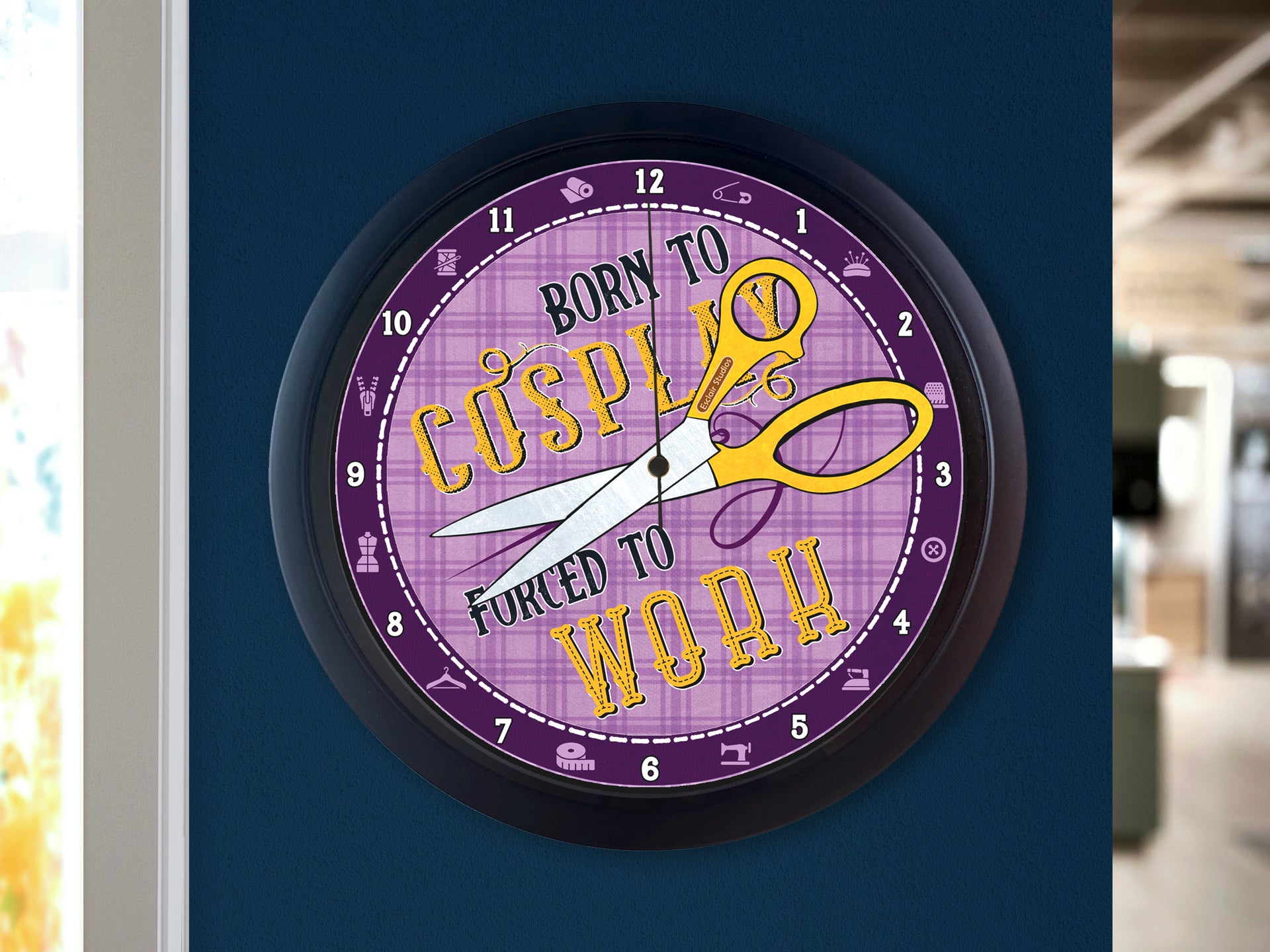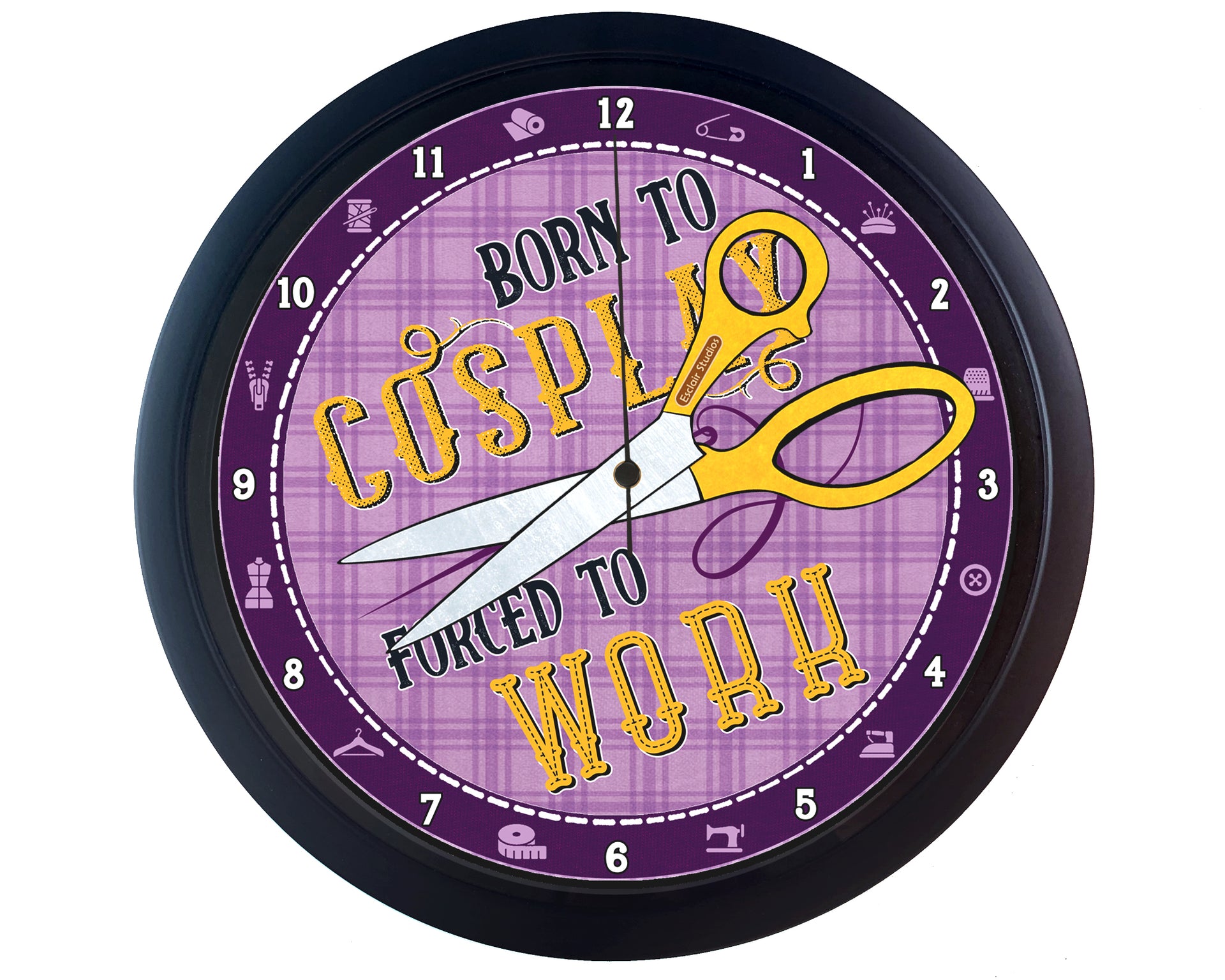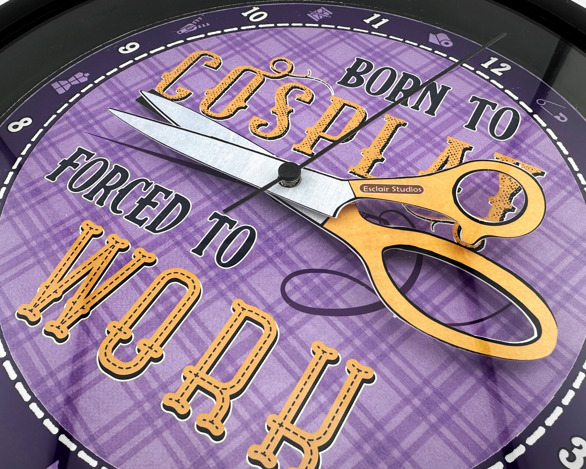 This vintage inspired wall clock featuring the cosplayers motto 'Born to Cosplay, forced to Work' includes various sewing imagery, it also has scissors fixed onto the clock hands. Making this a fun clock and the perfect gift for the cosplayer in your life.