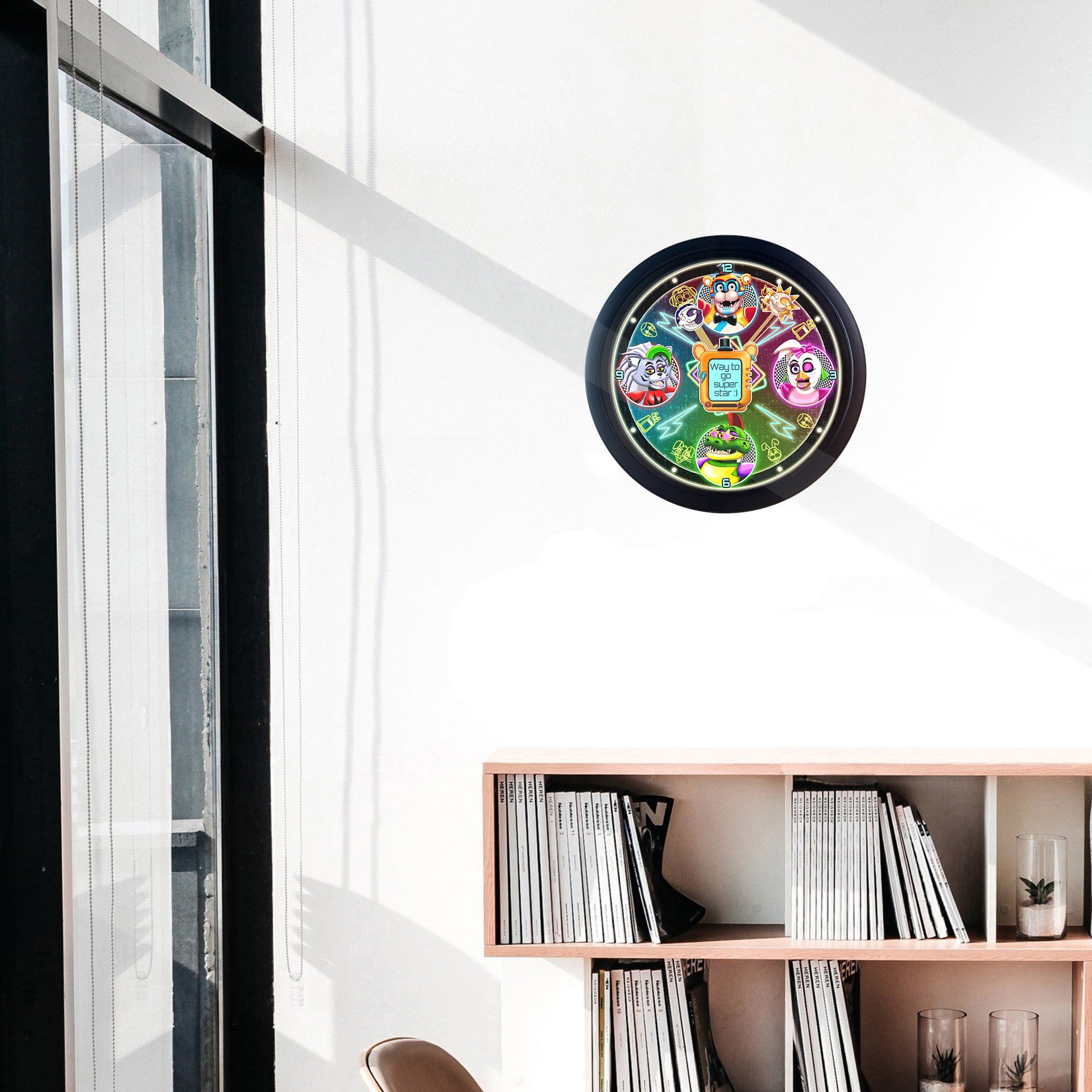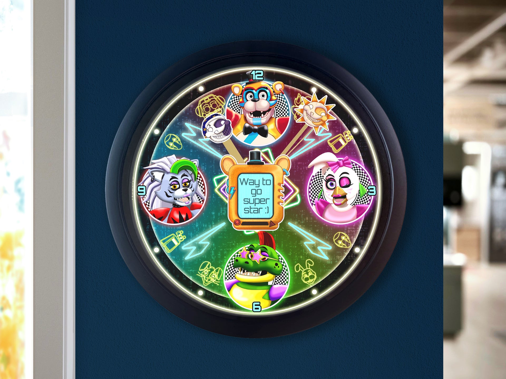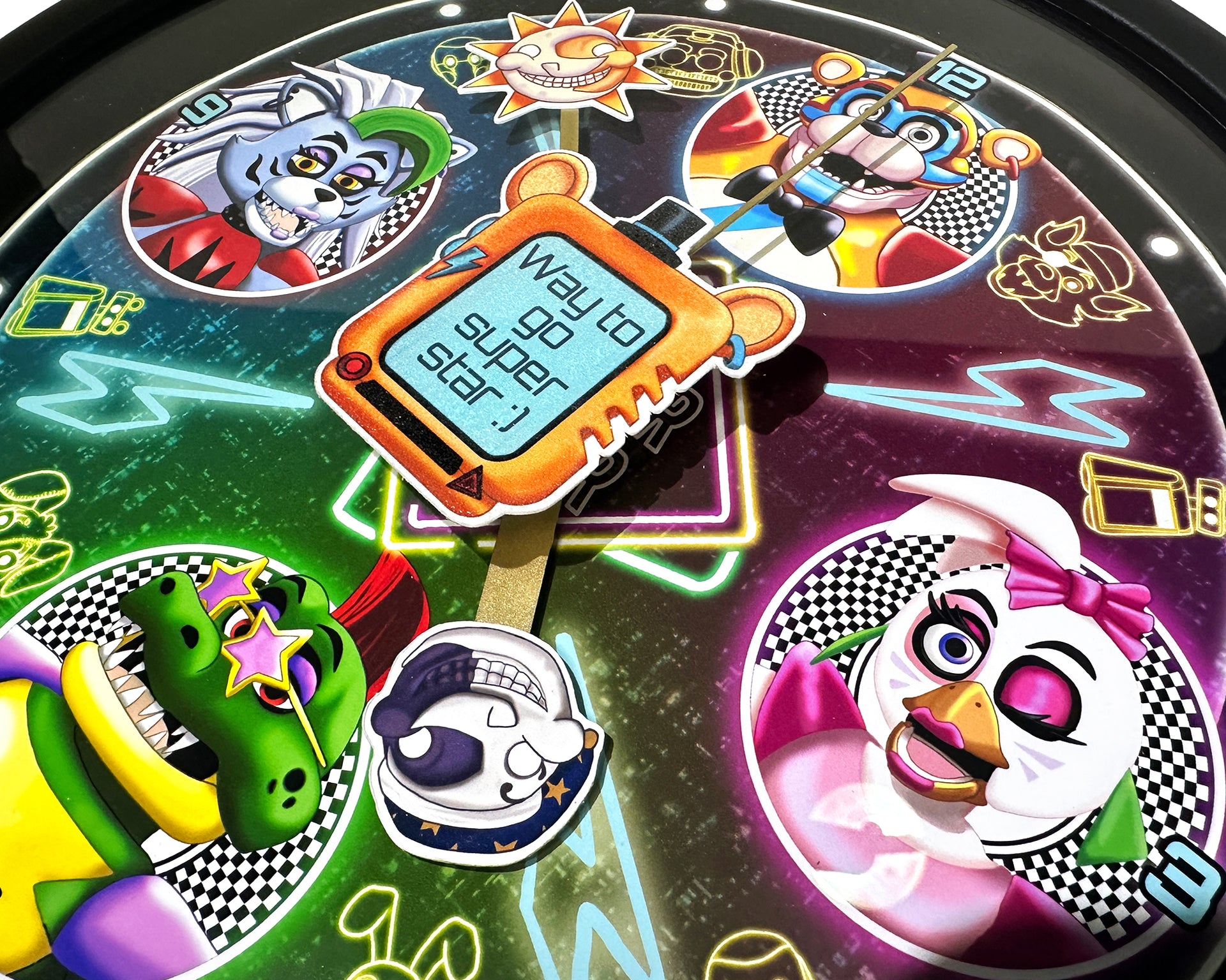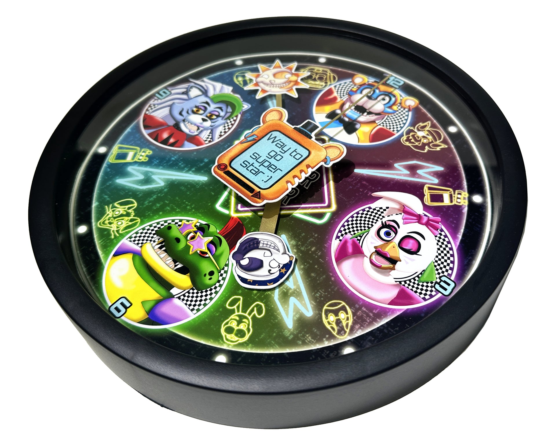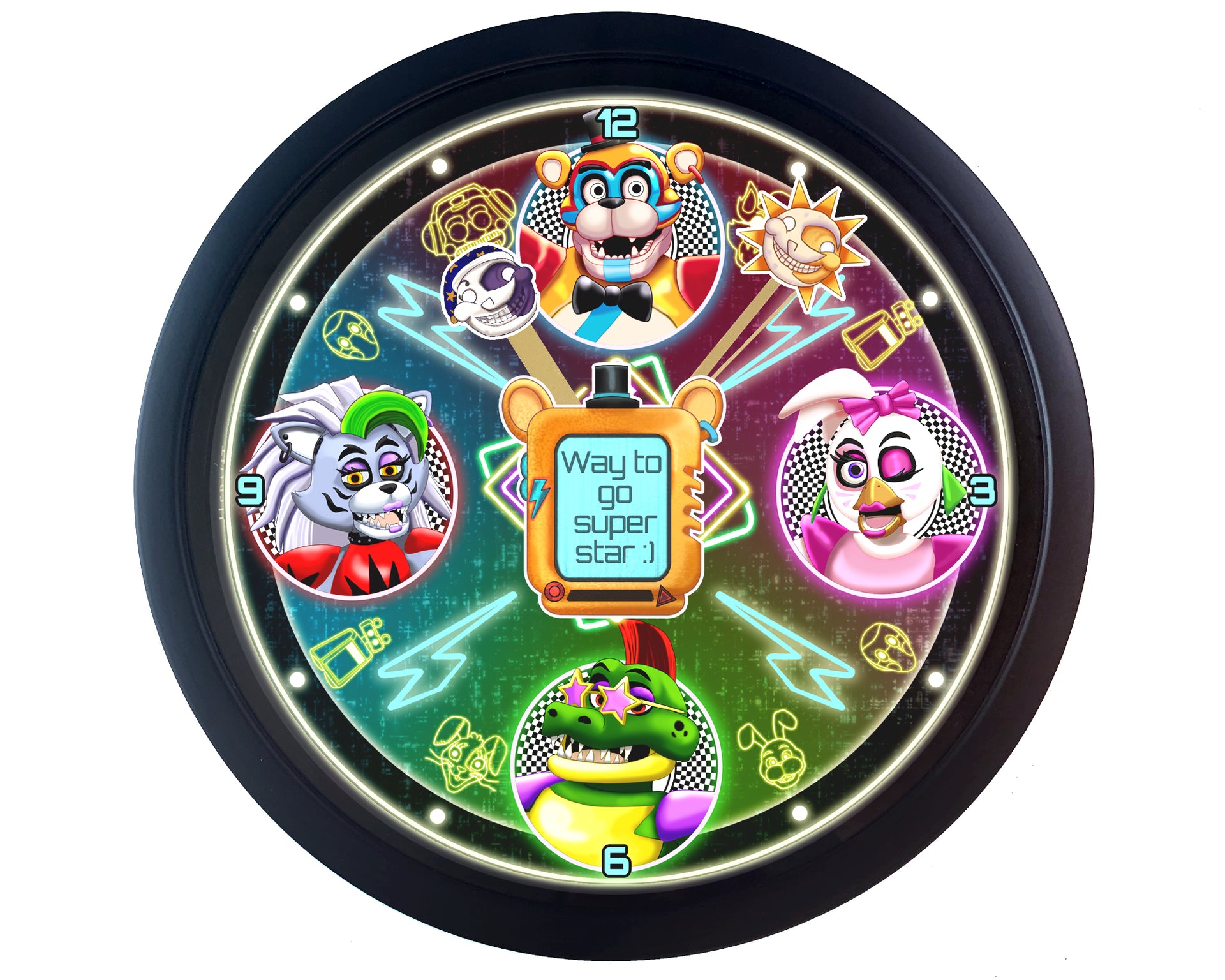 This Unique Wall Clock design is one of our Fan Artworks, featuring some of the characters from Security Breach, the perfect treat for yourself, a unique birthday gift, anniversary gift, Christmas gift, or even a housewarming gift. Our Clocks work well in an Office Setting, Kitchen, Classroom, Dorm Room, Living Spaces, and much more!