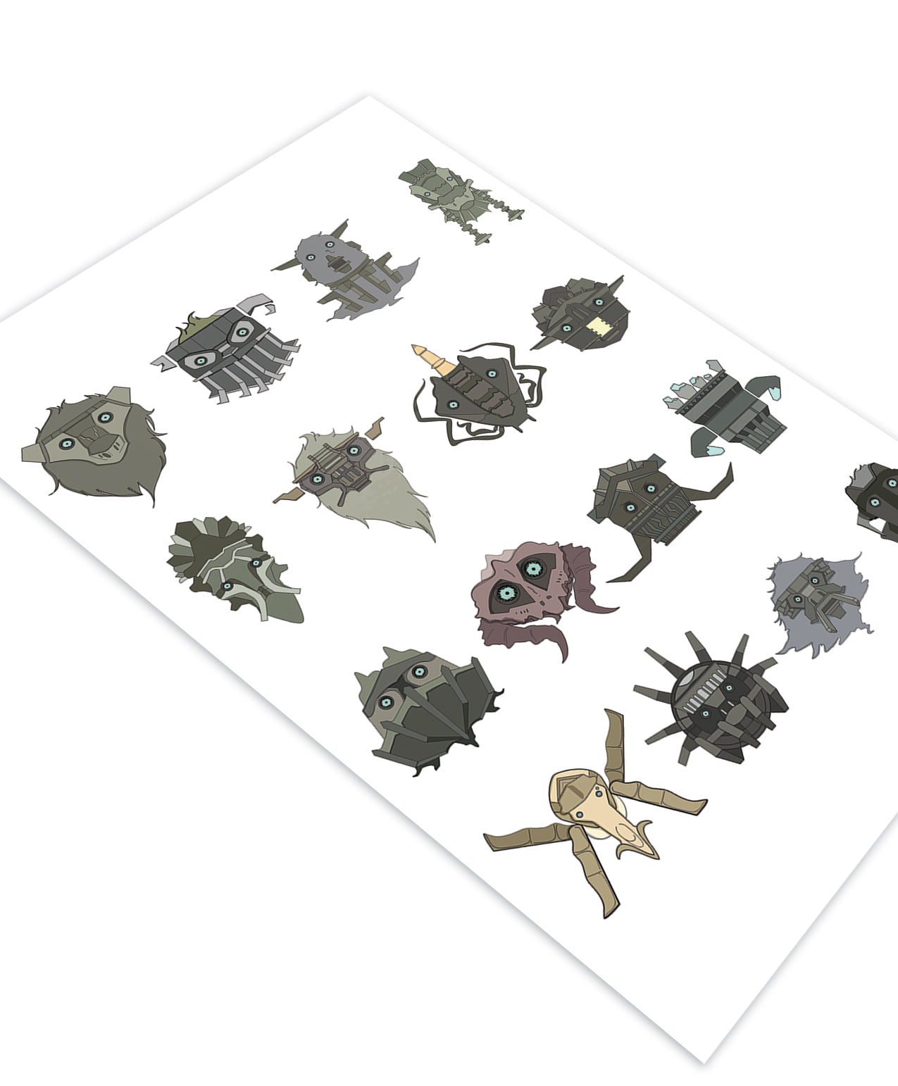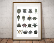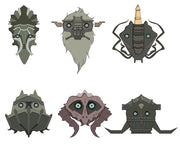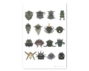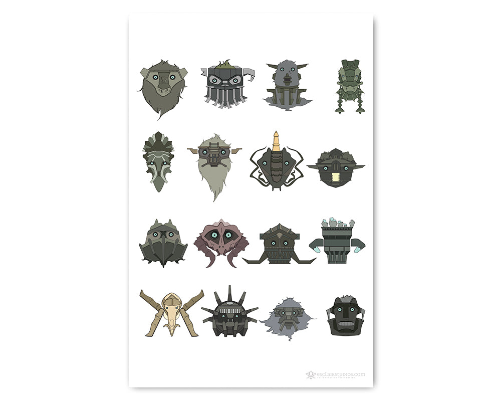 Isolation is nothing in the face of the Eighteen Colossi that are ready to battle. Commemorate a visual masterpiece with this Shadow of the Colossus Poster, featuring all Eighteen Colossi and the brave warrior protagonist, Wander, who conquered each of them. This is a very unique take to the game, iconizing each Colossi into a mask.